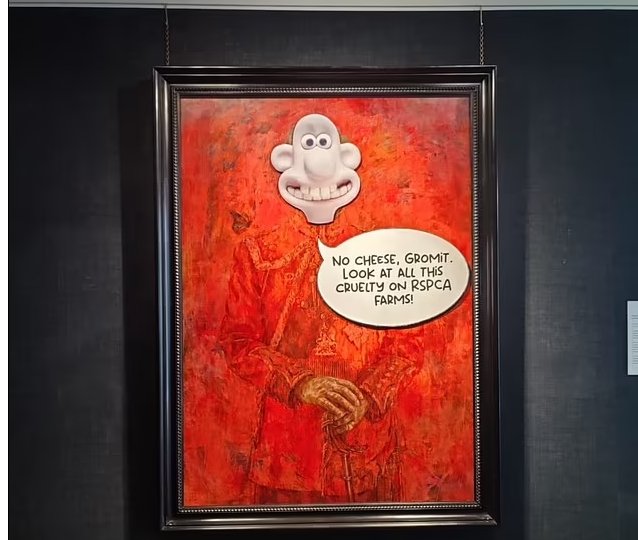 The portrait, which is the first official depiction of King Charles since his ascension to the throne, was inspired partly by his long-standing environmental advocacy. The activists used the popular animated characters Wallace and Gromit to draw attention to their cause. One poster featured Wallace’s face, while the other contained a speech bubble reading, “No Cheese, Gromit. Look At All This Cruelty On RSPCA Farms!”