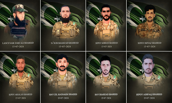 The martyred soldiers were identified as Naib Subedar Muhammad Shehzad, Havildar Zil-e-Hussain, Havildar Shahzad Ahmed, Sepoy Ashfaq Hussain Khan, Sepoy Sobhan Majeed, Sepoy Imtiaz Khan, Sepoy Arsalan Aslam of the Pakistan Army, and Lance Naik Sabz Ali of the Frontier Constabulary.