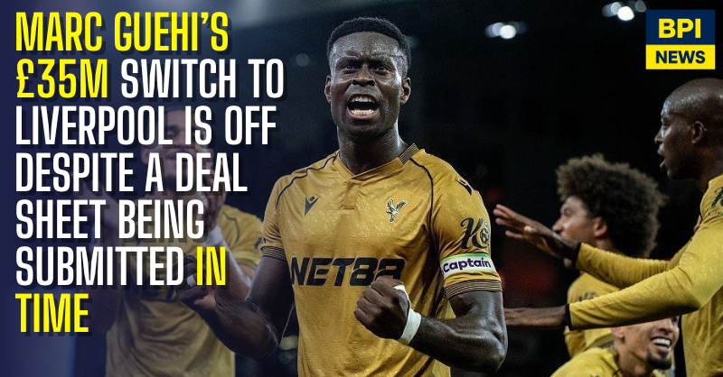 Marc Guehi’s proposed £35 million move from Crystal Palace to Liverpool has collapsed, despite a deal sheet being submitted in time for the transfer deadline.