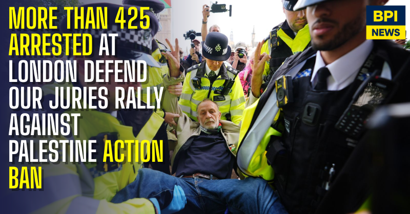 More than 425 people were arrested in Westminster on Saturday during a large demonstration against the government’s ban on the campaign group Palestine Action.