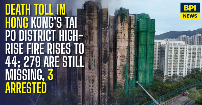 The death toll from the Wang Fuk Court high-rise fire in Hong Kong has risen to 44, officials confirmed on Thursday, with 45 people critically injured and 279 still unaccounted for.