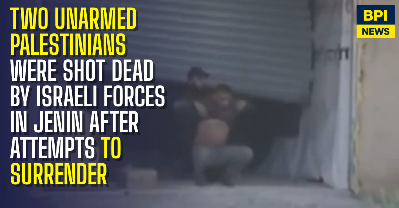 Israeli forces have shot and killed two Palestinian men in the occupied West Bank city of Jenin, with witnesses and video footage indicating they were attempting to surrender when they were killed.