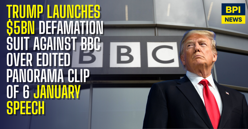 US President Donald Trump has filed a $5bn lawsuit against the BBC, accusing the broadcaster of defamation and deceptive trade practices over an edited clip of his 6 January 2021 speech used in a Panorama documentary. The case, filed in Florida, claims the BBC “intentionally, maliciously, and deceptively” altered the sequence of his remarks, giving the impression that he made a direct call for violent action at the US Capitol.