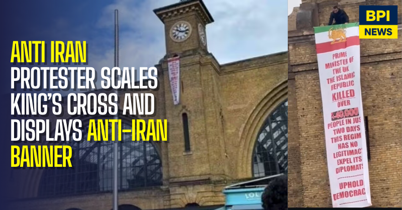 The protester climbed close to the station’s clock tower and remained on the roof for several hours while holding a banner displaying the Iranian tricolour and a lion-and-sun emblem.