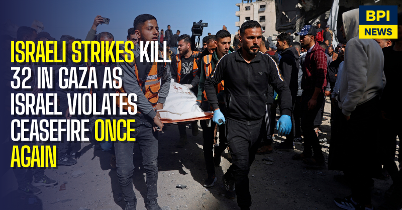 Israeli air strikes killed 32 people including children in Gaza on Saturday, according to the Palestinian territory’s civil defence agency, as the military said it had attacked in response to a Hamas ceasefire violation.