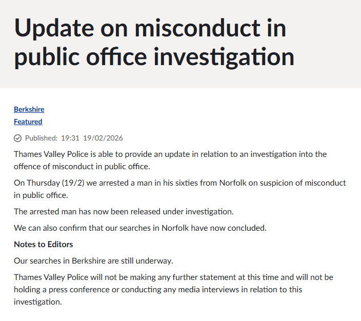Andrew Mountbatten-Windsor has been released under investigation after being arrested on suspicion of misconduct in public office, Thames Valley Police have confirmed.