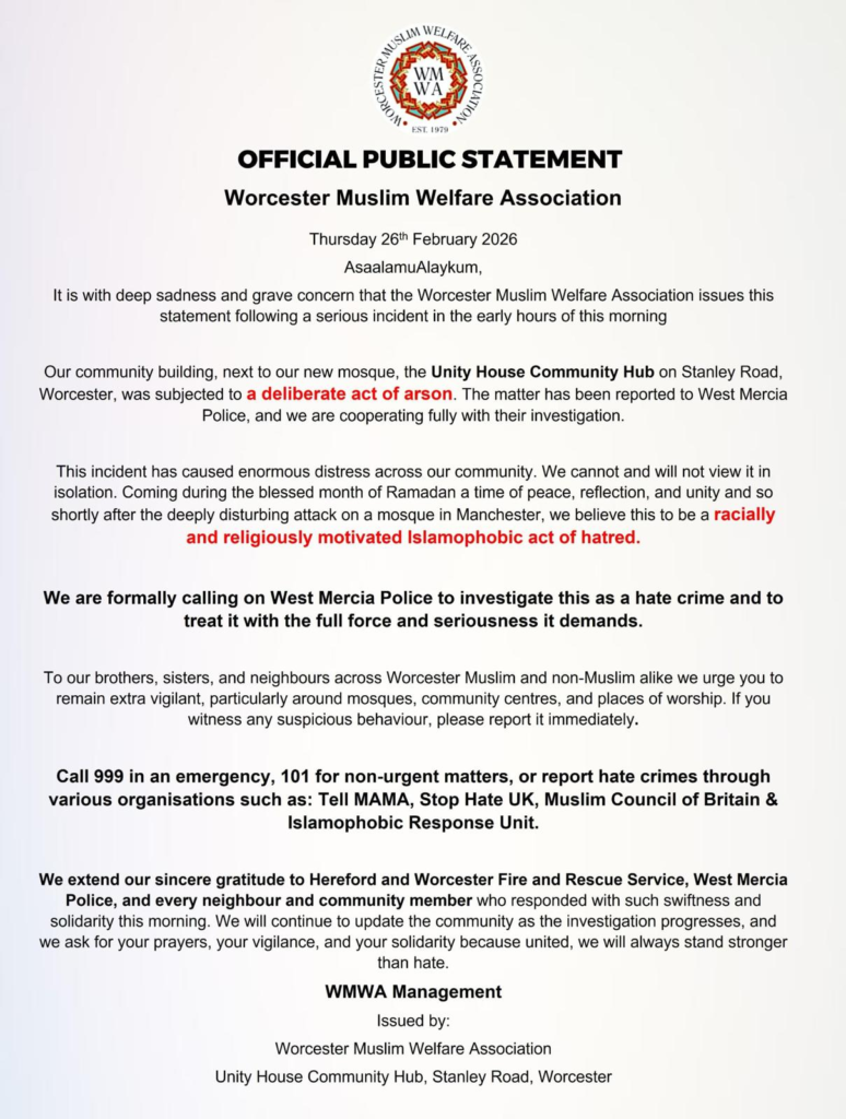In an official public statement dated 26 February 2026, WMWA confirmed the building had been subjected to what it described as a “deliberate act of arson”. The matter has been reported to West Mercia Police, with the association confirming full cooperation with the investigation.
