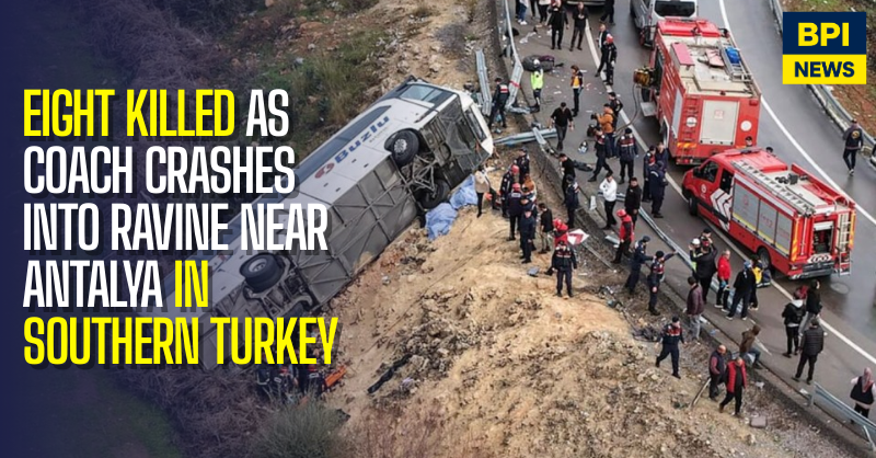 At least eight people have died and 26 others have been injured after a passenger coach overturned and plunged around 50 feet into a ravine near Antalya, in southern Turkey, authorities have confirmed.