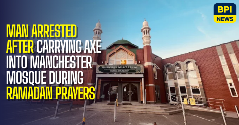 The incident took place during Taraweeh prayers, with approximately 2,000 worshippers inside the mosque at the time. Mosque representatives said volunteers challenged a white man wearing a high-visibility jacket who had entered the building carrying a large bag. After noticing what appeared to be an axe handle inside the bag, volunteers escorted him to a separate room away from worshippers and contacted police.