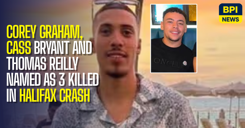 Three young men who died in a multi-vehicle collision in Halifax have been named as Corey Graham, 22, Cass Bryant and Thomas Reilly, both aged 21.