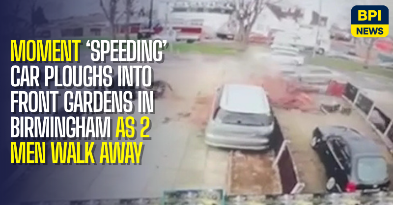 Footage has captured the moment a car ploughed into front gardens and parked vehicles in Birmingham, causing extensive damage before two men left the scene.