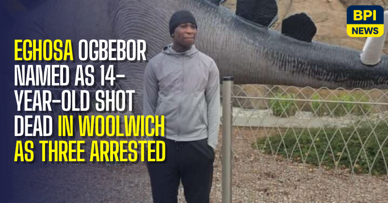 Eghosa Ogbebor has been named as the 14-year-old boy shot dead on Lord Warwick Street in Woolwich, south-east London, with three suspects arrested on suspicion of murder, according to the Metropolitan Police.
